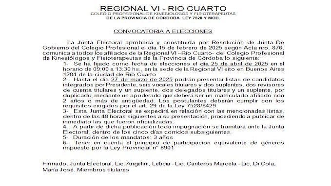17Mar CONVOCATORIA A ELECCIONES 25 DE ABRIL 2025 Regional 62025-03-17T20:38:59-03:00 Convócase a Alecciones para el día 25 de Abril de 2025 en sede. Sin categoría0 Comments Read more...